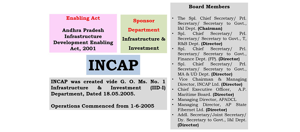 The recognition of the need to rope in private sector as development partners led the Govt. of Andhra Pradesh to create the Infrastructure Corporation of Andhra Pradesh Ltd. (INCAP) on 31st May, 2005, as a part of the Department of Infrastructure and Investment. INCAP was envisaged to expressly increase the pace of infrastructure development by assisting the setting up and development of Public Private Partnership Projects in the State. It is designated to don the multiple roles of a Developer, Advisory, Financier and Manager as needed and to render a full range of services in every phase of project development, from their inception to the completion.